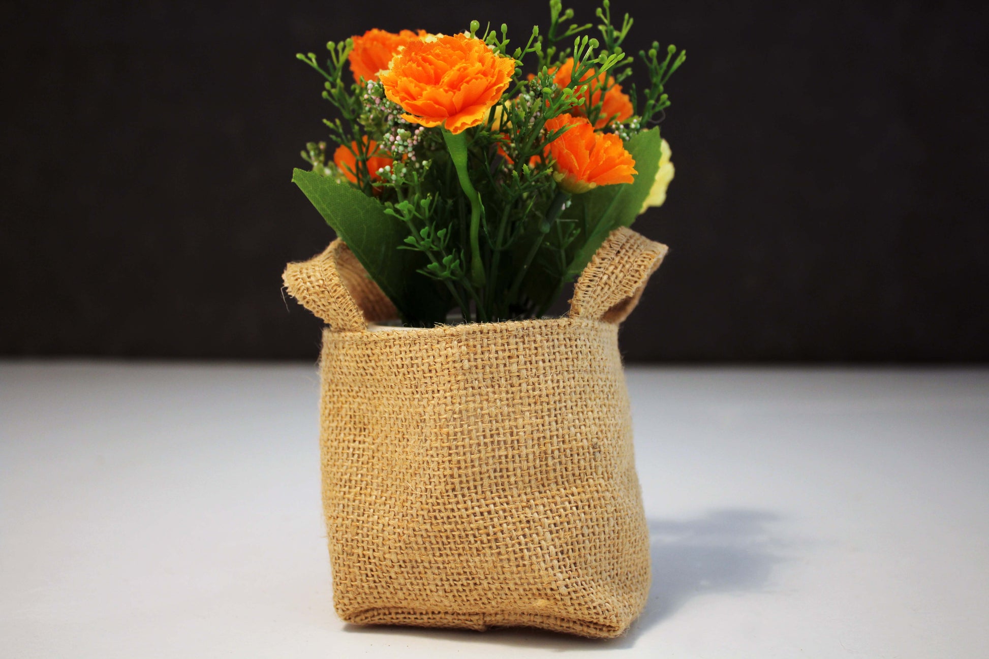 Realizzato internamente da noi con tessuto in juta resistente e dall’aspetto autentico, è perfetto per valorizzare piccoli vasi, composizioni floreali o oggetti decorativi. La struttura morbida ma stabile garantisce un risultato ordinato ed elegante.